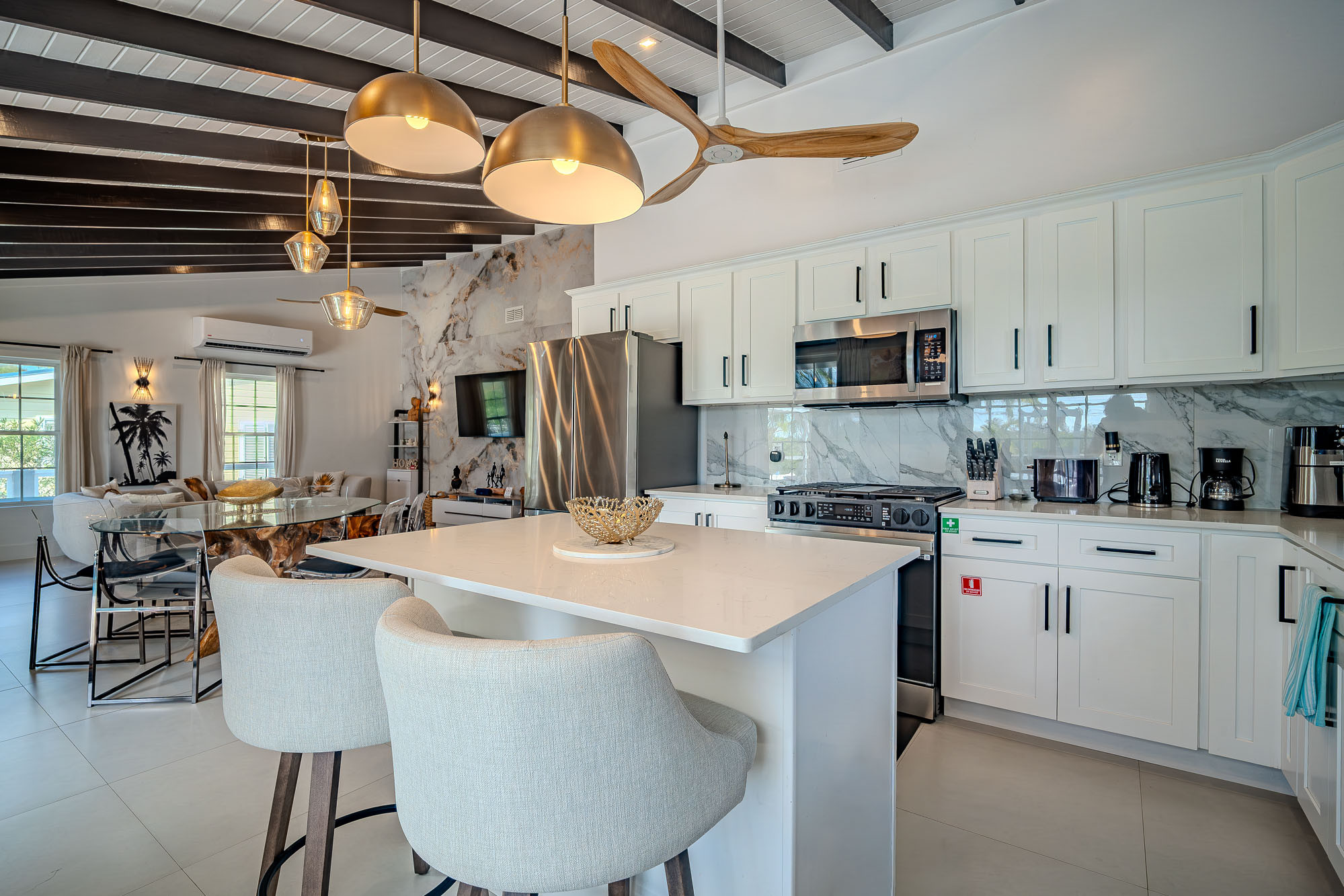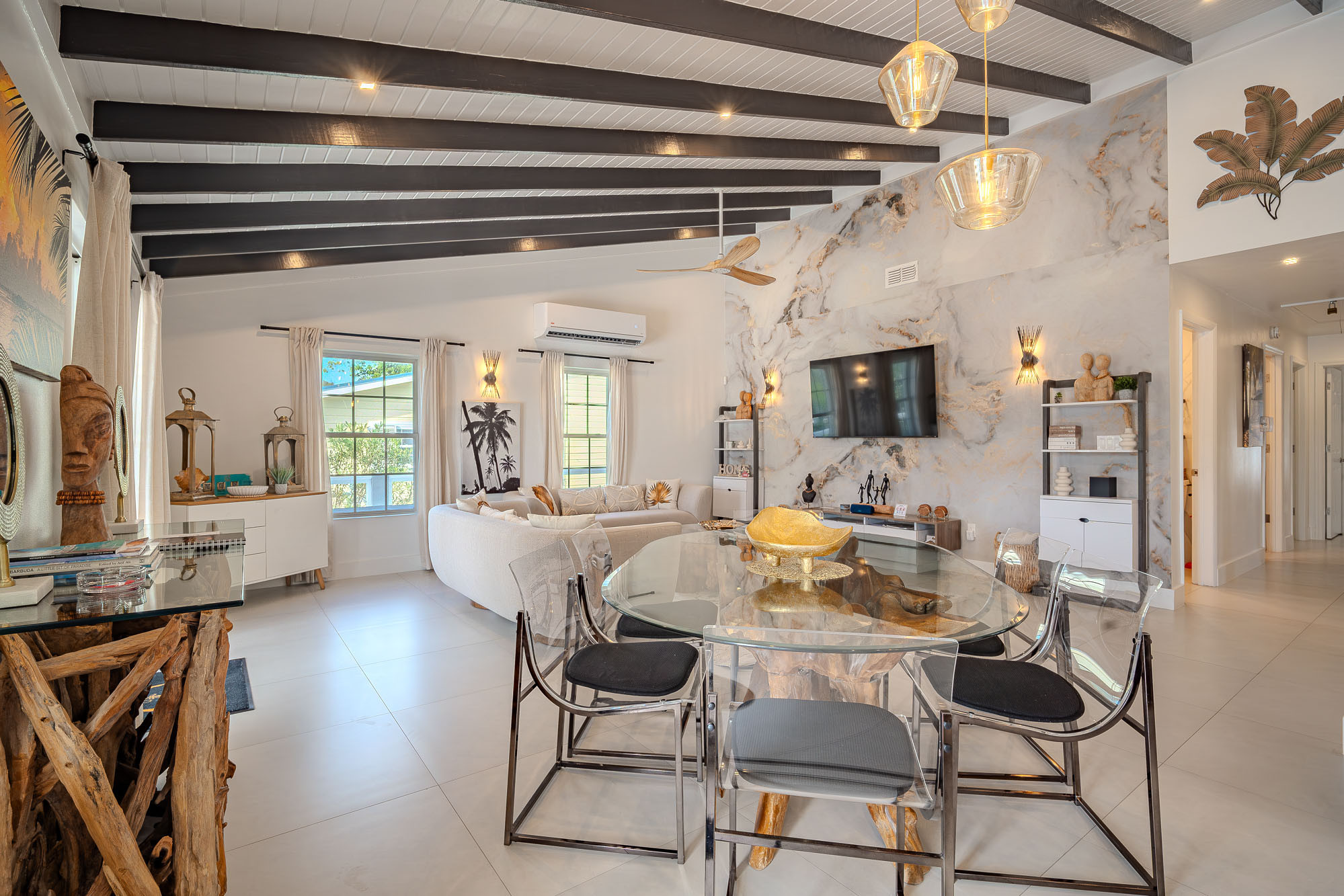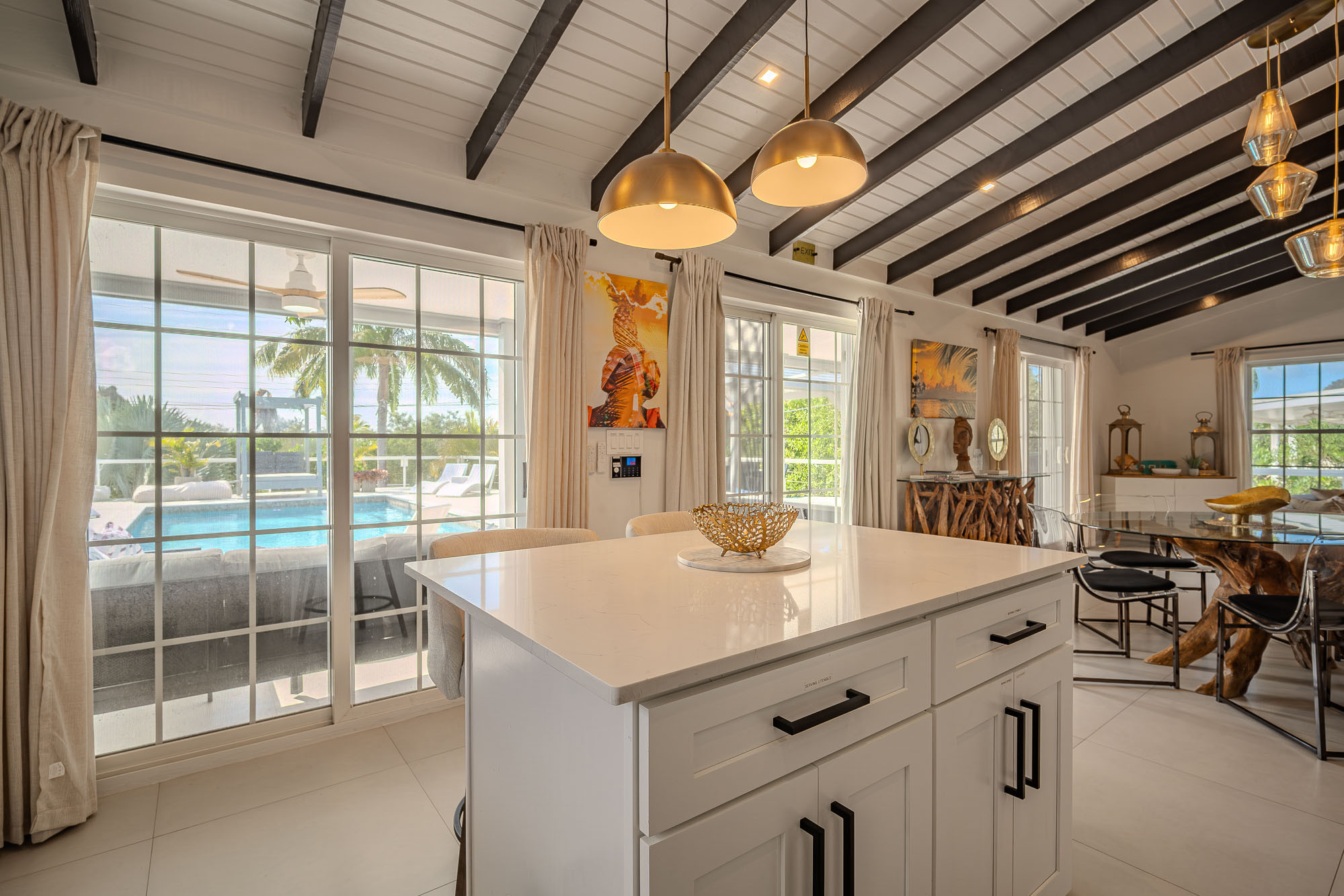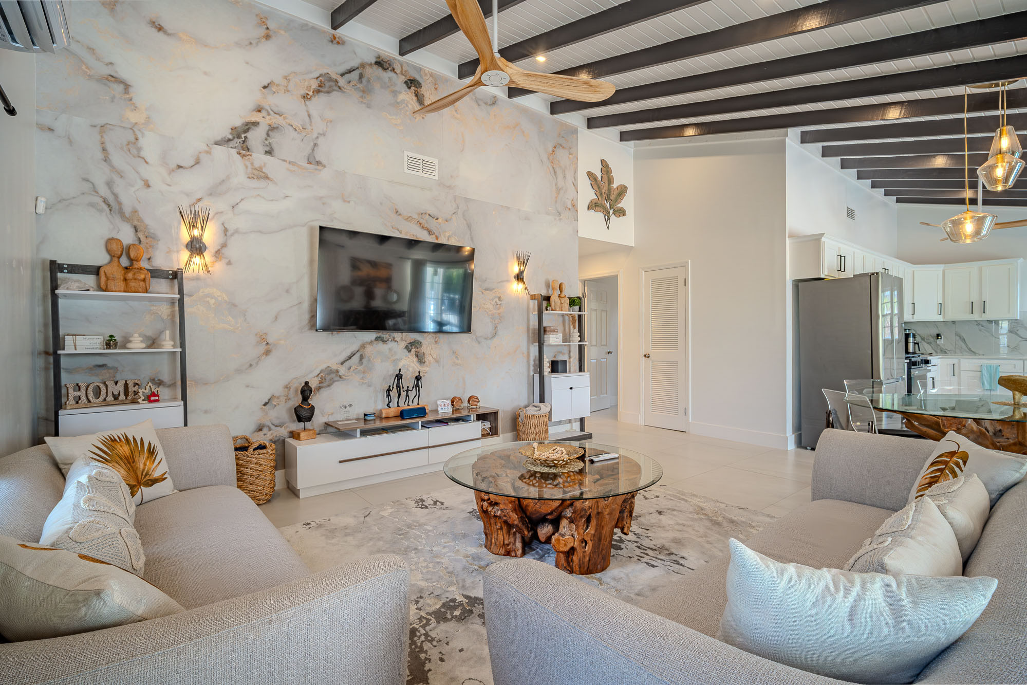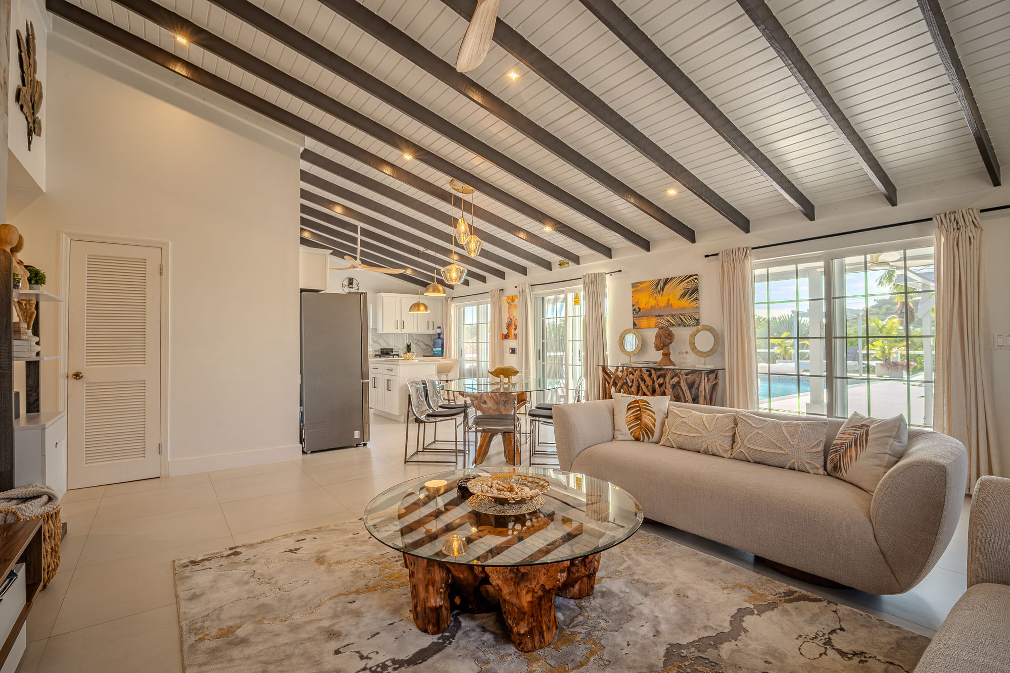 The living room features a traditional Caribbean style vaulted 12ft ceiling. There is a 65 inch flat screen smart TV, blue tooth speakers and two three seater sofas. There is a natural wood glass side board, coffee table and six seater dining table, with additional seating for two at the breakfast bar in the kitchen.