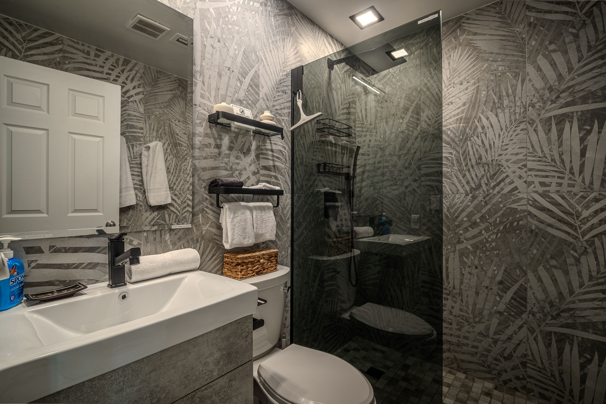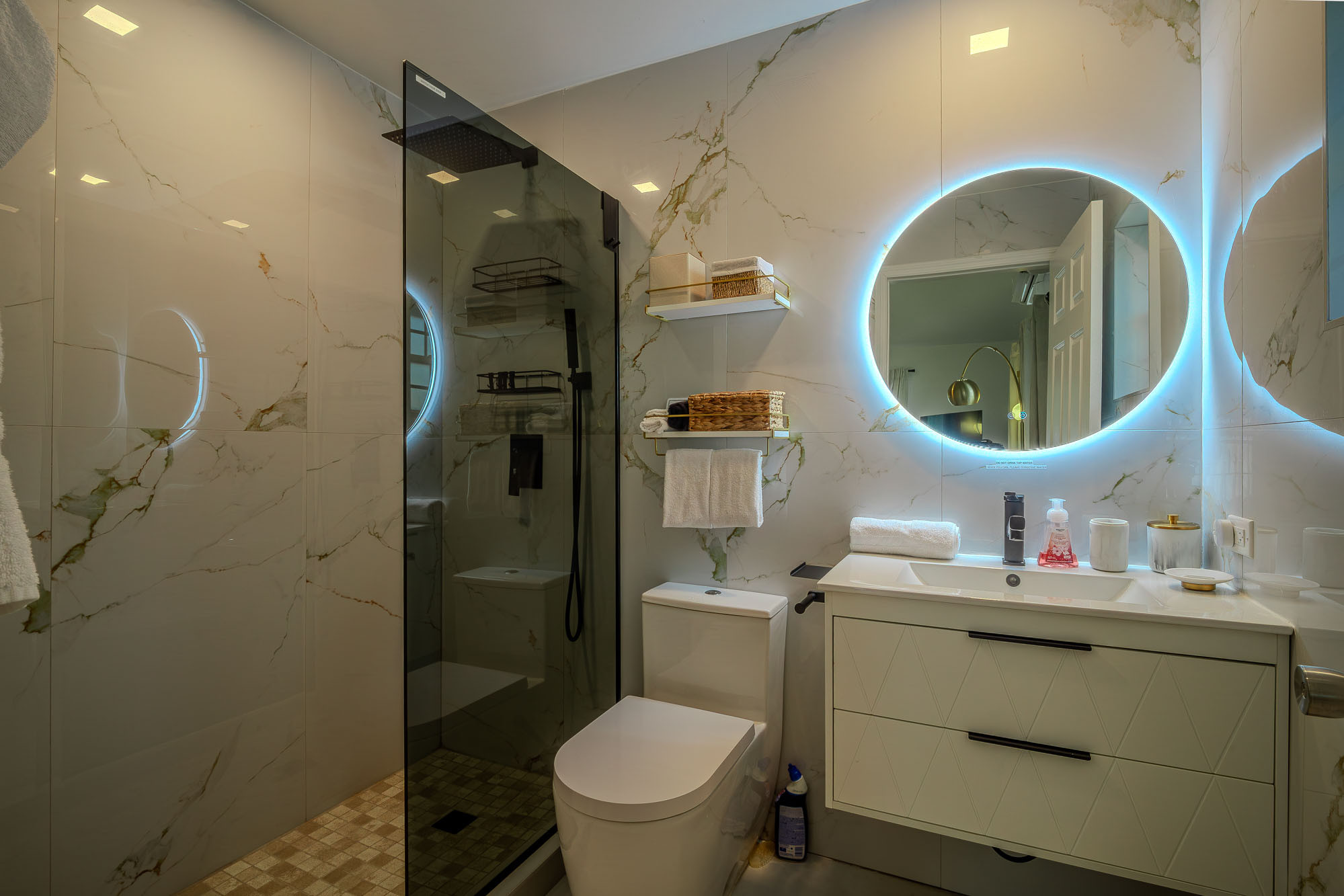 The primary suite features it’s very own bold statement wall. It also has double built in wardrobes with ventilation, a chest of drawers and a mirror. The marble style en-suite bathroom with gold accents has the same matt black fixtures and fittings and large rainfall shower as the others. And a design choice we particularly love, is that as well as the king size bed, but there is also a seating area from which you can watch your flat screen 55 inch tv. The owners have spared no expense getting this luxury holiday rental ready for its discerning guests and Villa Coby is now ready for you to enjoy. We think you will love it as much as we do.