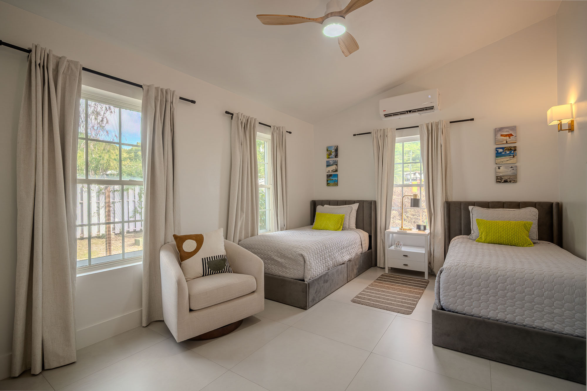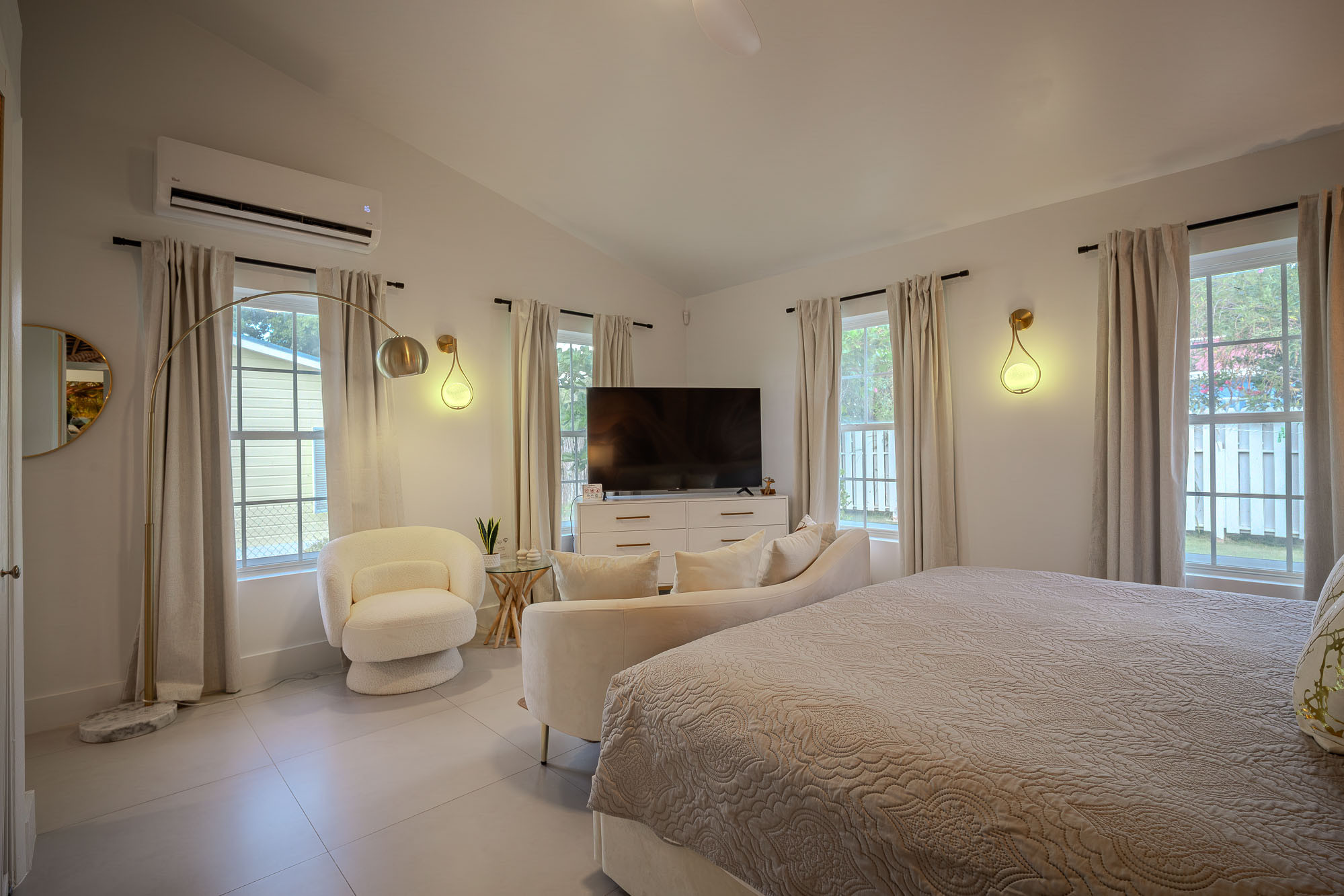 Each of the four beautifully decorated bedrooms offers ample space and comfort. The primary suite features a romantic four-poster bed and private en-suite bathroom, creating a serene escape for relaxation. The secondary bedroom with two queen beds is perfect for families or friends, while the remaining two bedrooms each offer a comfortable queen bed. With two additional bathrooms to service these three bedrooms, every guest has access to convenience and privacy and air-conditioning throughout and a full laundry/utility room with a washing machine all help to make your stay more comfortable.