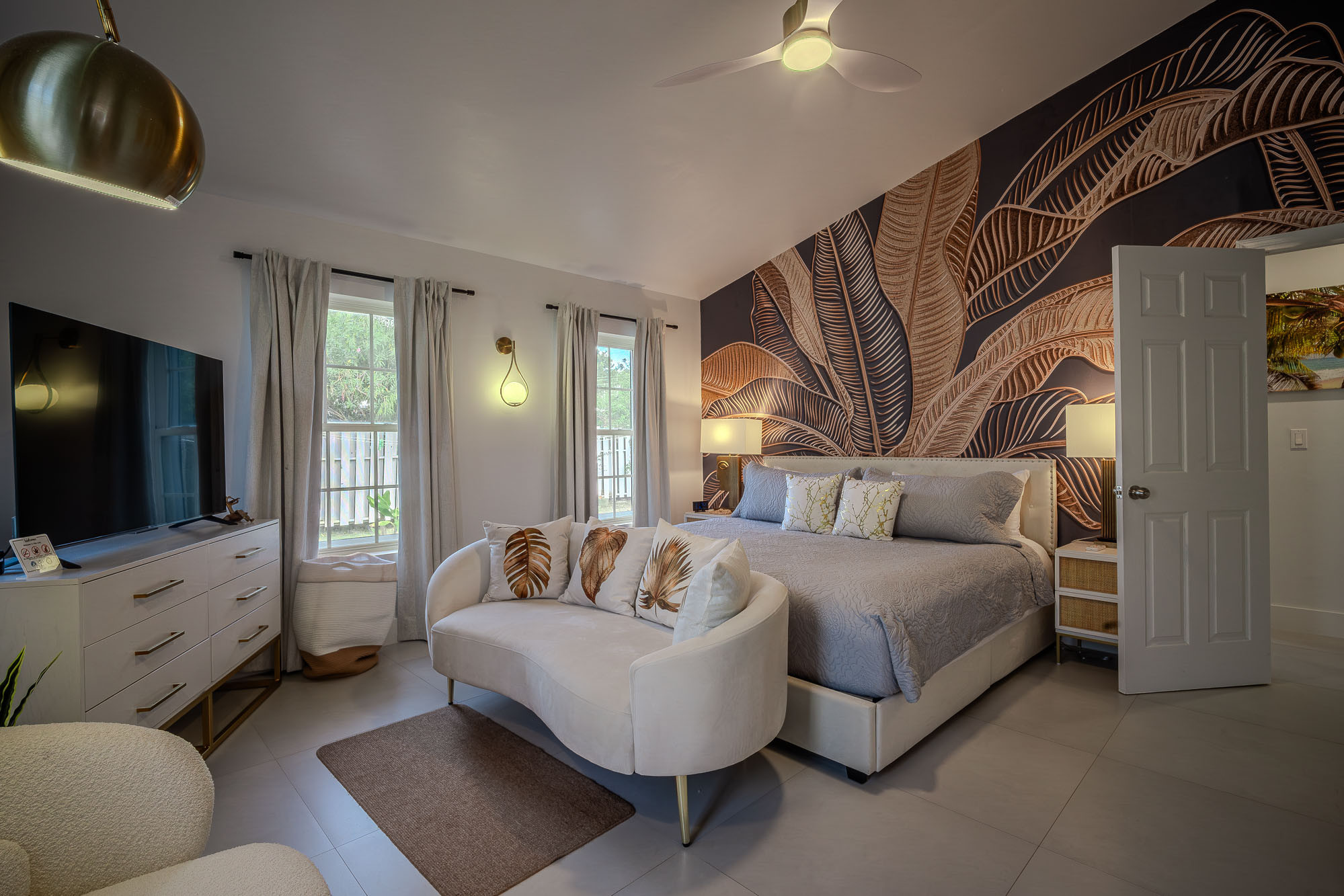 As you enter the property through the glass sliding doors your eyes will be immediately drawn to the contemporary feature wall in the open plan living room and kitchen. As well as the immediate wow factor, you will notice that this statement wall also perfectly captures the design theme of the entire villa, where simplicity and decadence combine to bring you barefoot elegance. There is a variety of furniture made from natural wood, fauna inspired motifs on the walls and tiles and gold fixtures and fittings throughout the property. There are ceiling fans and air conditioning throughout the property.