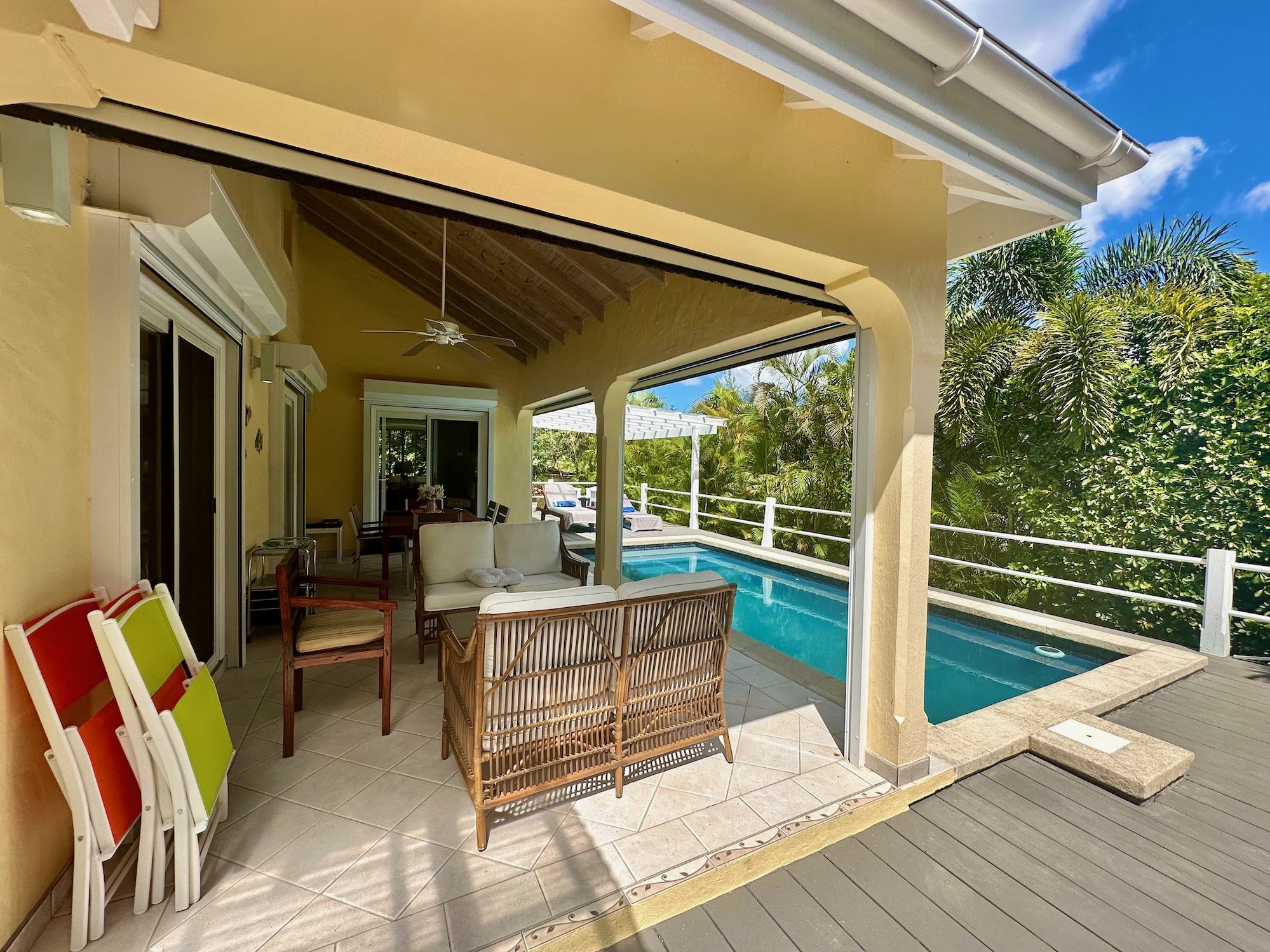 Enjoy the best of Caribbean outdoor living with a large swimming pool, sun deck, and covered lounging and dining areas. Mozi blinds enclose the space for an intimate evening ambiance, ideal for al fresco dining or drinks under the stars.