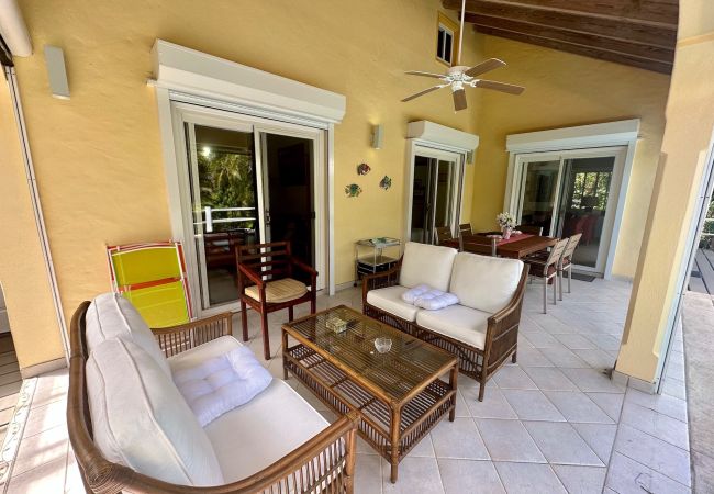 Lush tropical surroundings and serene views of the nearby golf course.