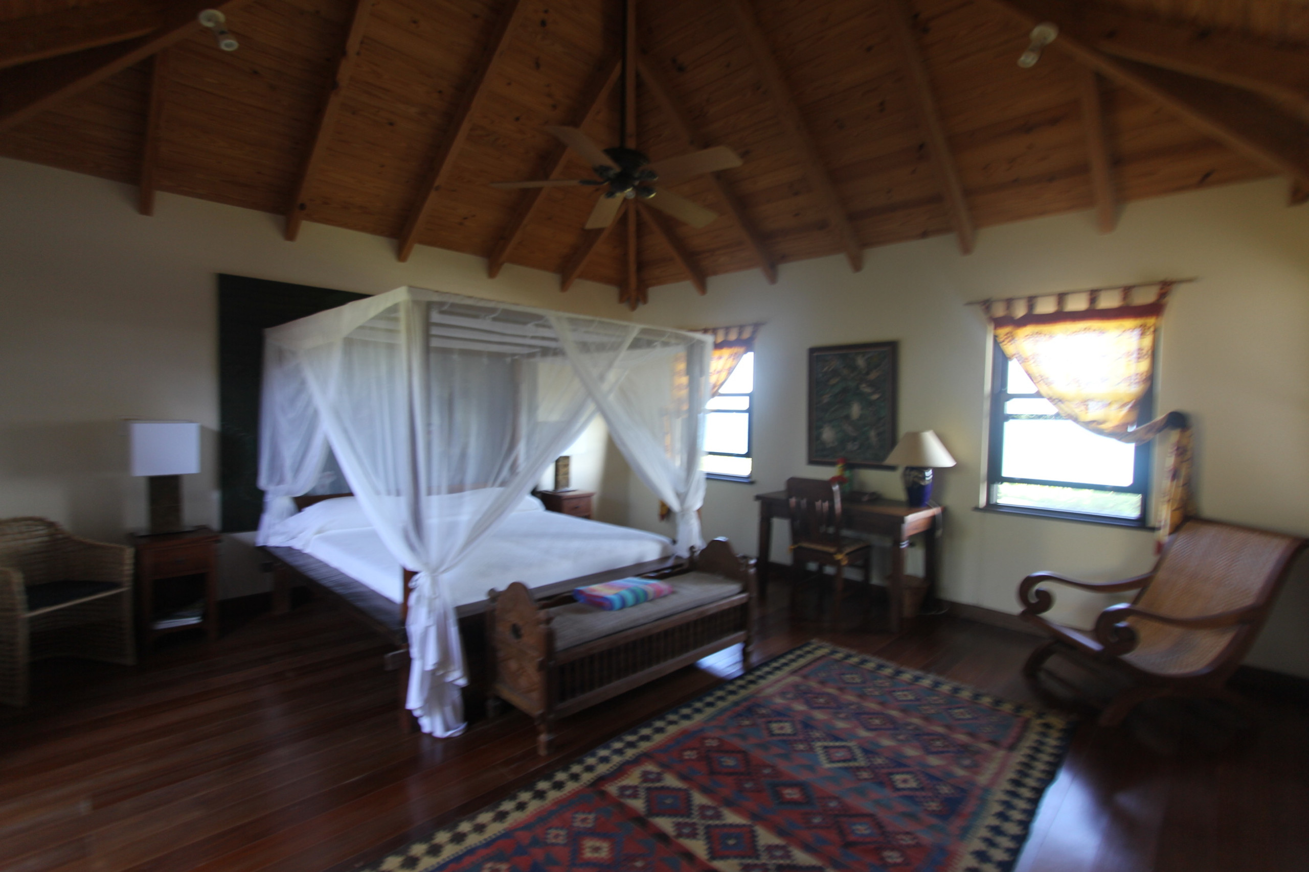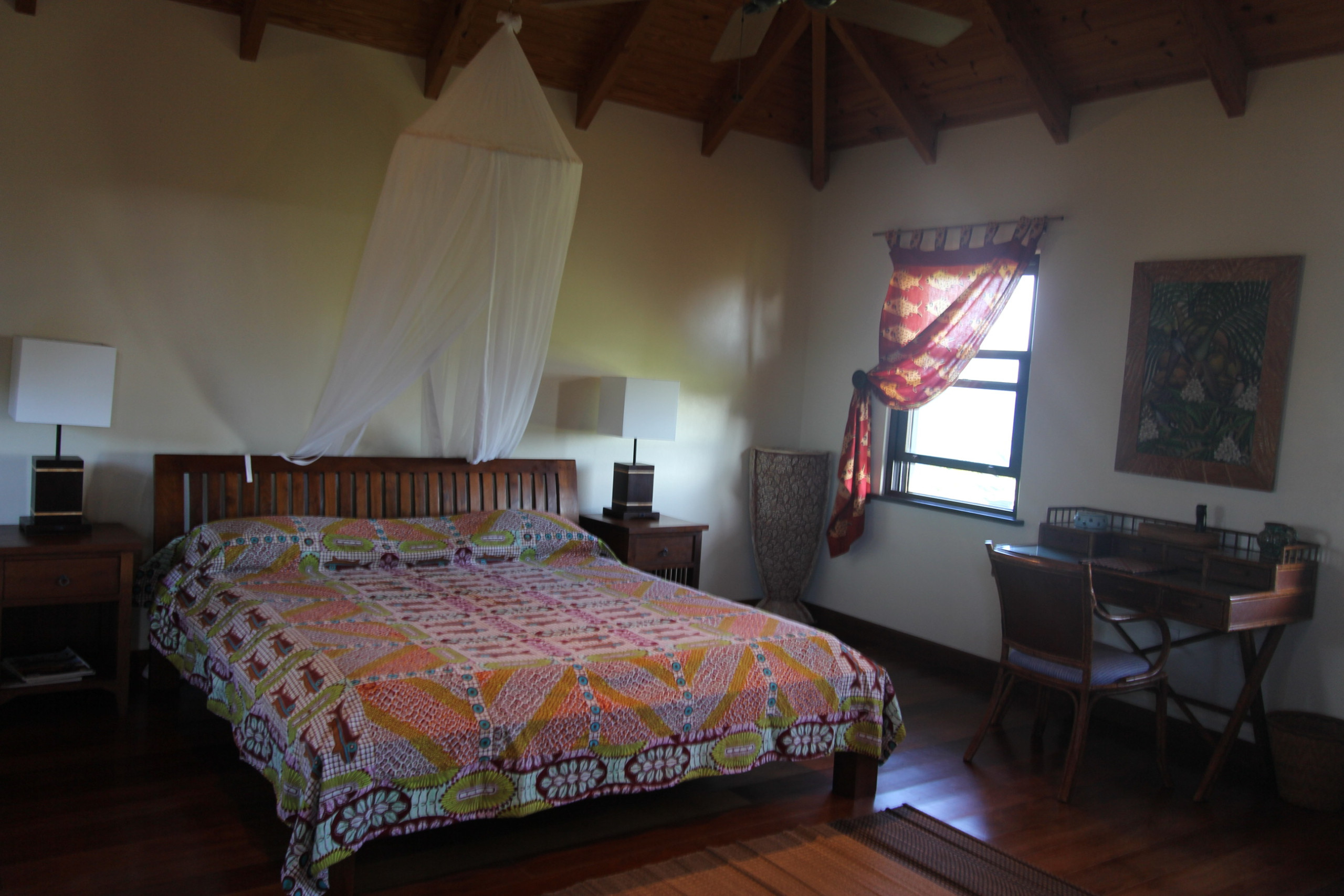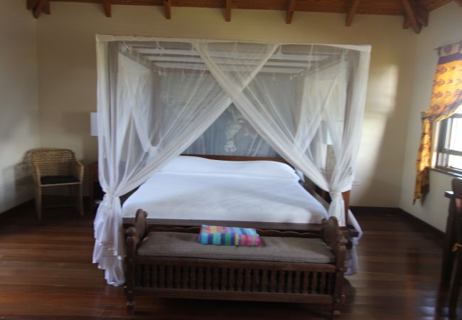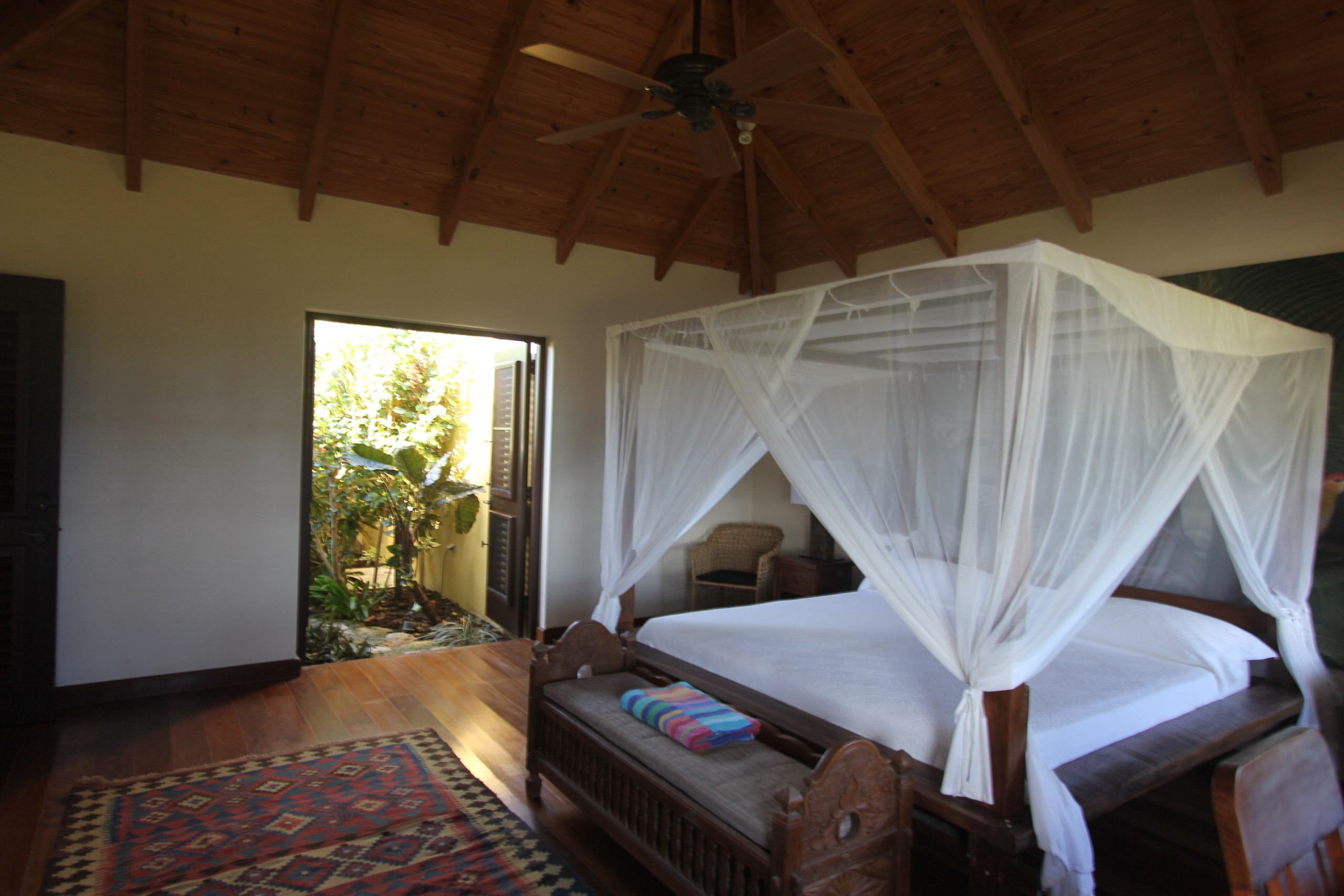 Bedroom 2: King-sized canopy bed, ceiling fan, tranquil garden views, en-suite bathroom with garden shower, double vanity, and WC.
