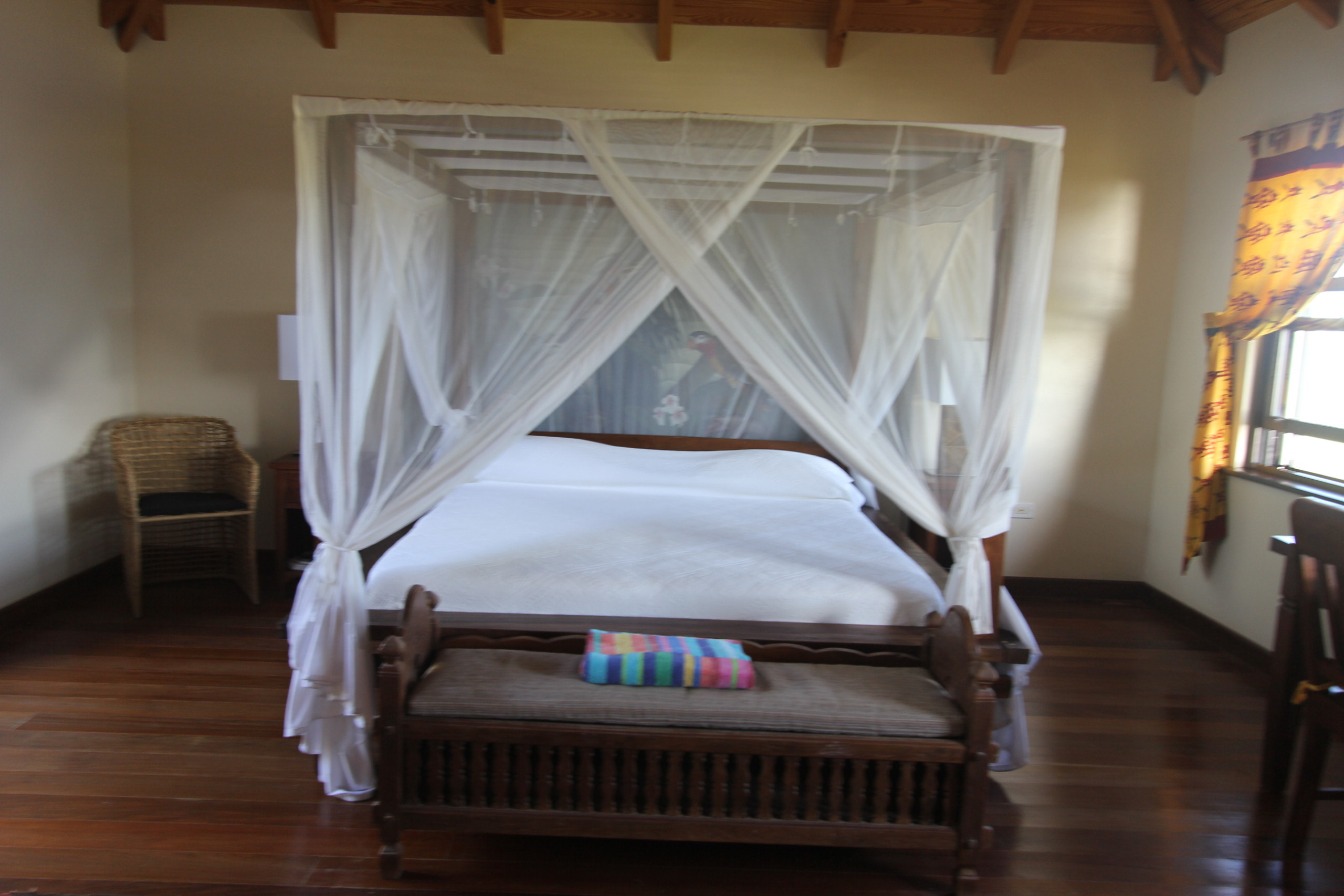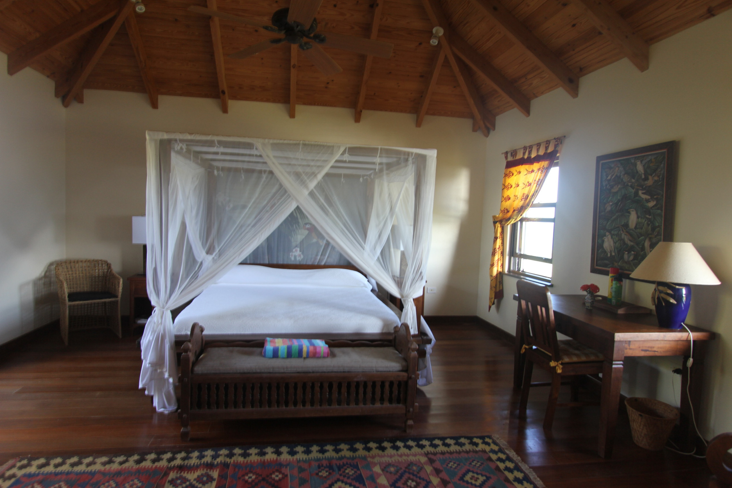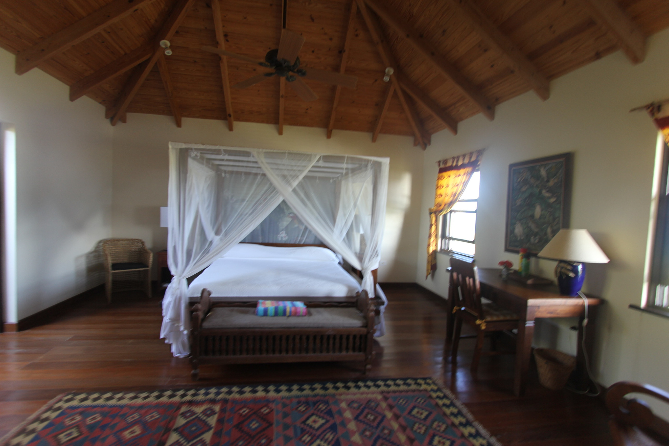 Bedroom 2: King-sized canopy bed, ceiling fan, tranquil garden views, en-suite bathroom with garden shower, double vanity, and WC.