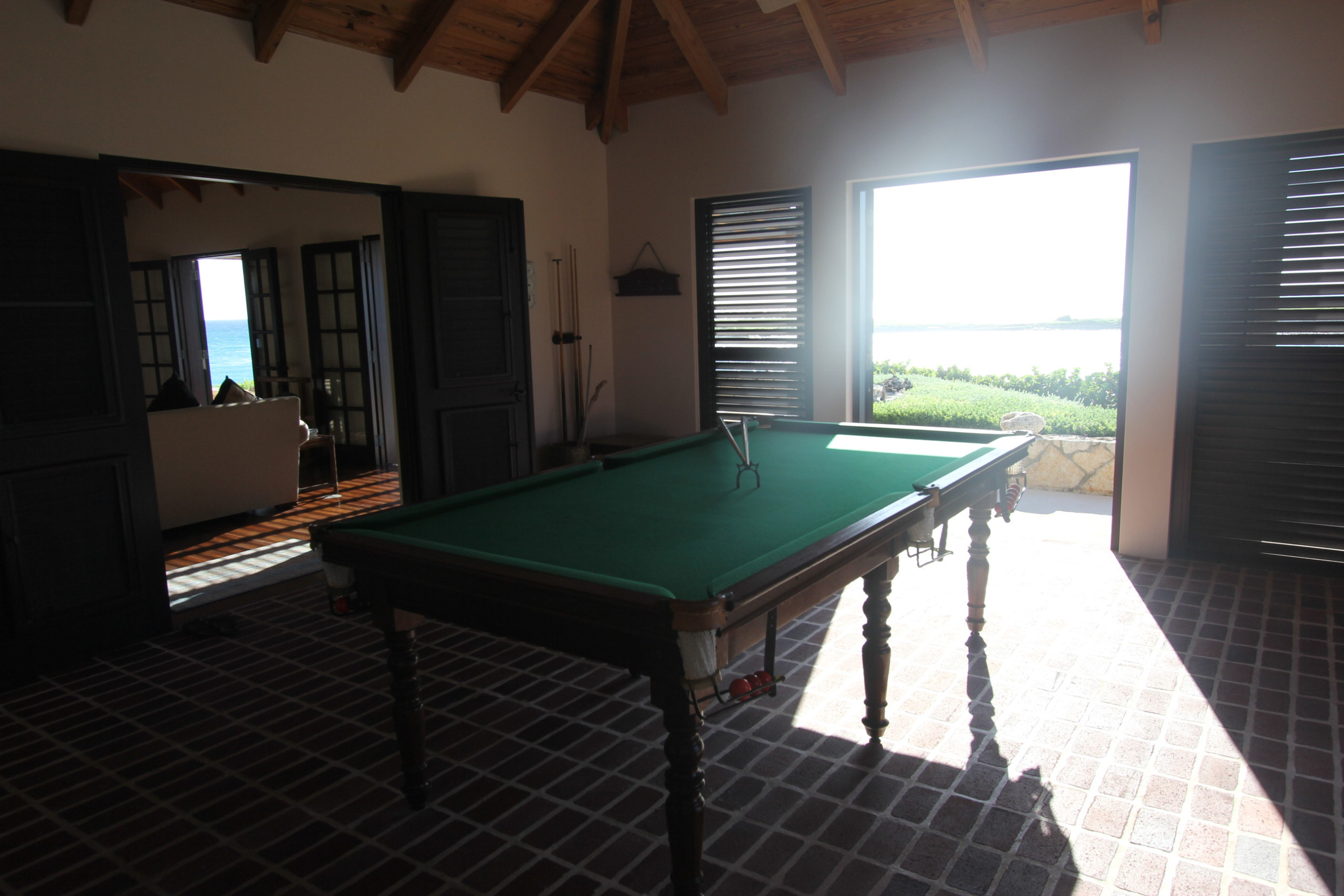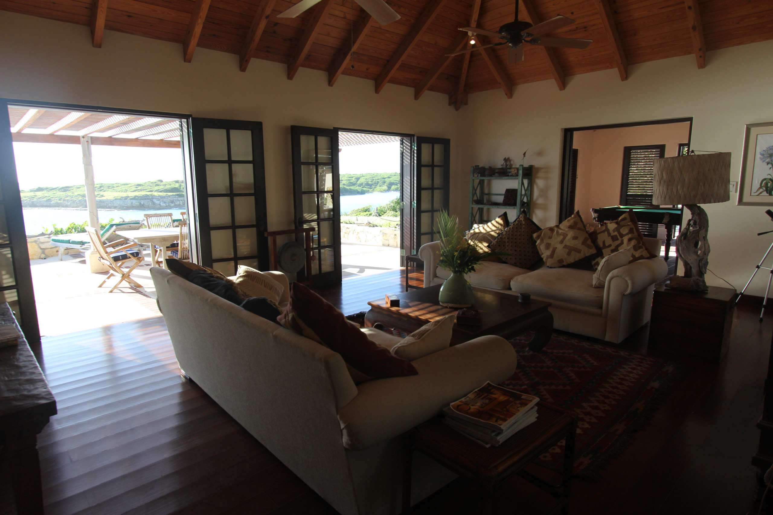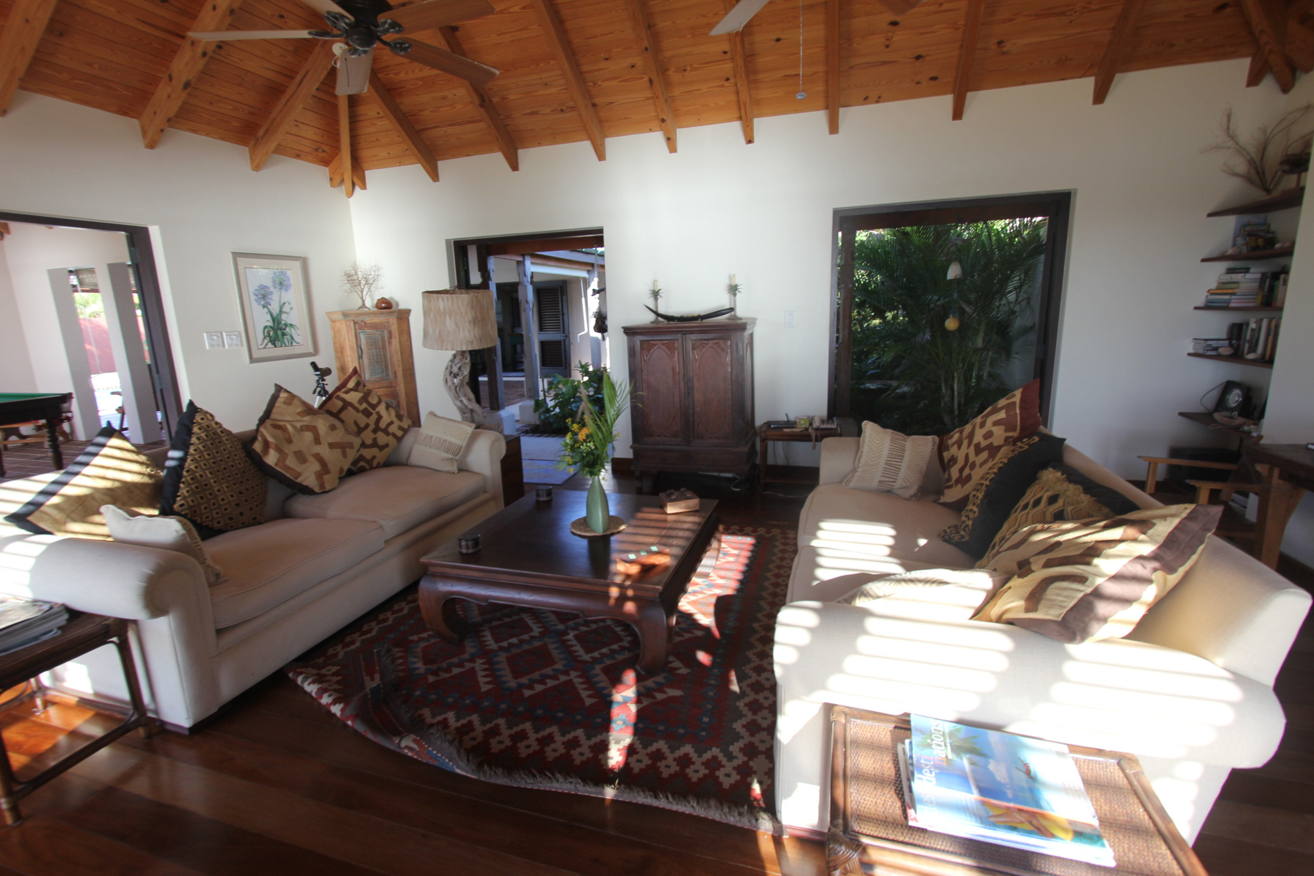 Step through oversized French doors into the villa’s great room, where wood floors and honey-stained ceilings create a warm and inviting ambiance. Light, airy interiors are accented with Balinese textiles and rugs, offering a harmonious blend of comfort and style. Enjoy entertainment in the living room, challenge friends to a game in the pool table-equipped game room, or dine outdoors under the stars.