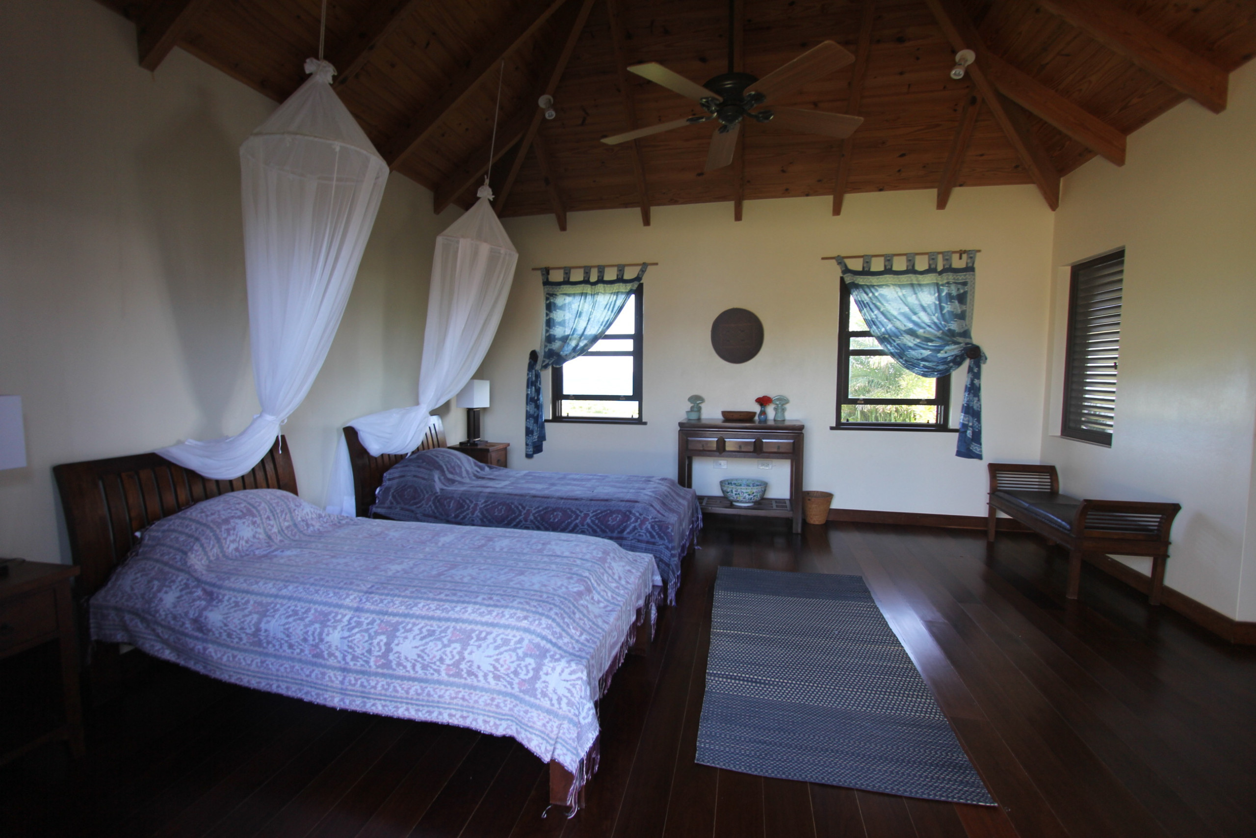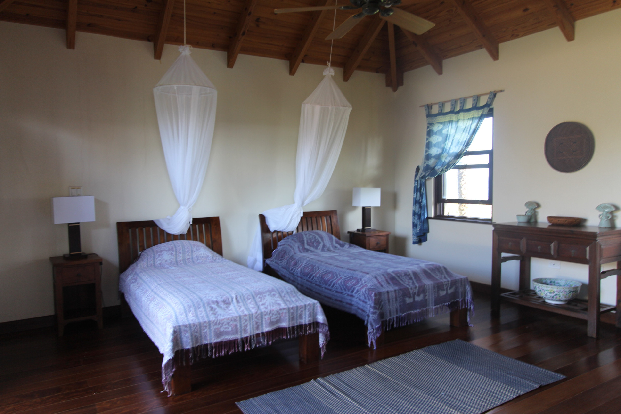 Bedroom 4: Twin beds, ceiling fan, garden views, en-suite bathroom with garden shower, vanity, and WC.