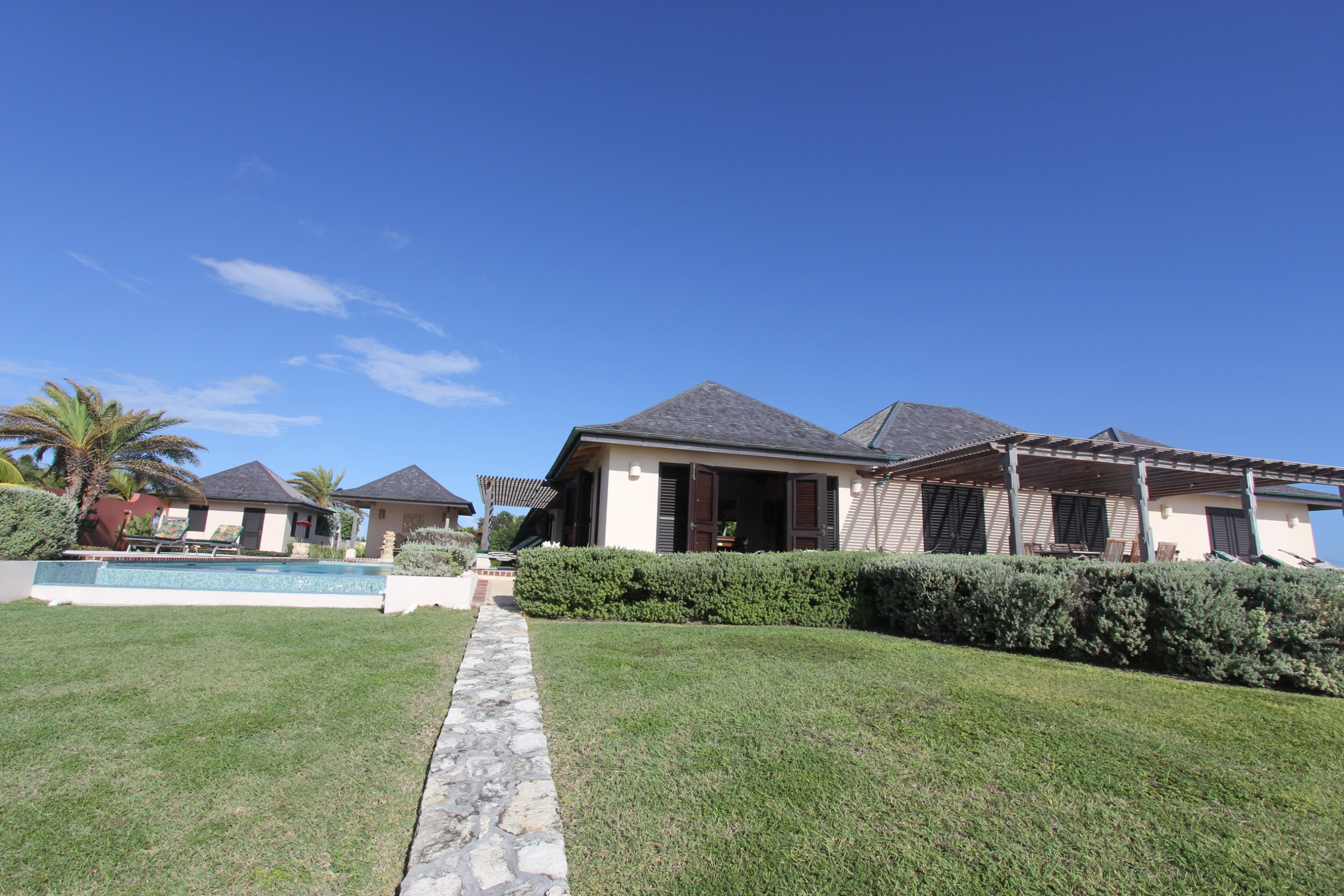 Nestled within a lush, private garden adorned with mature palms, vibrant tropical flowers, and manicured lawns, Villa Kulala can be your own personal oasis. The property features a series of pavilion-style buildings connected by picturesque covered walkways, terraces, and outdoor rooms.