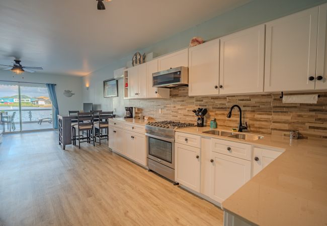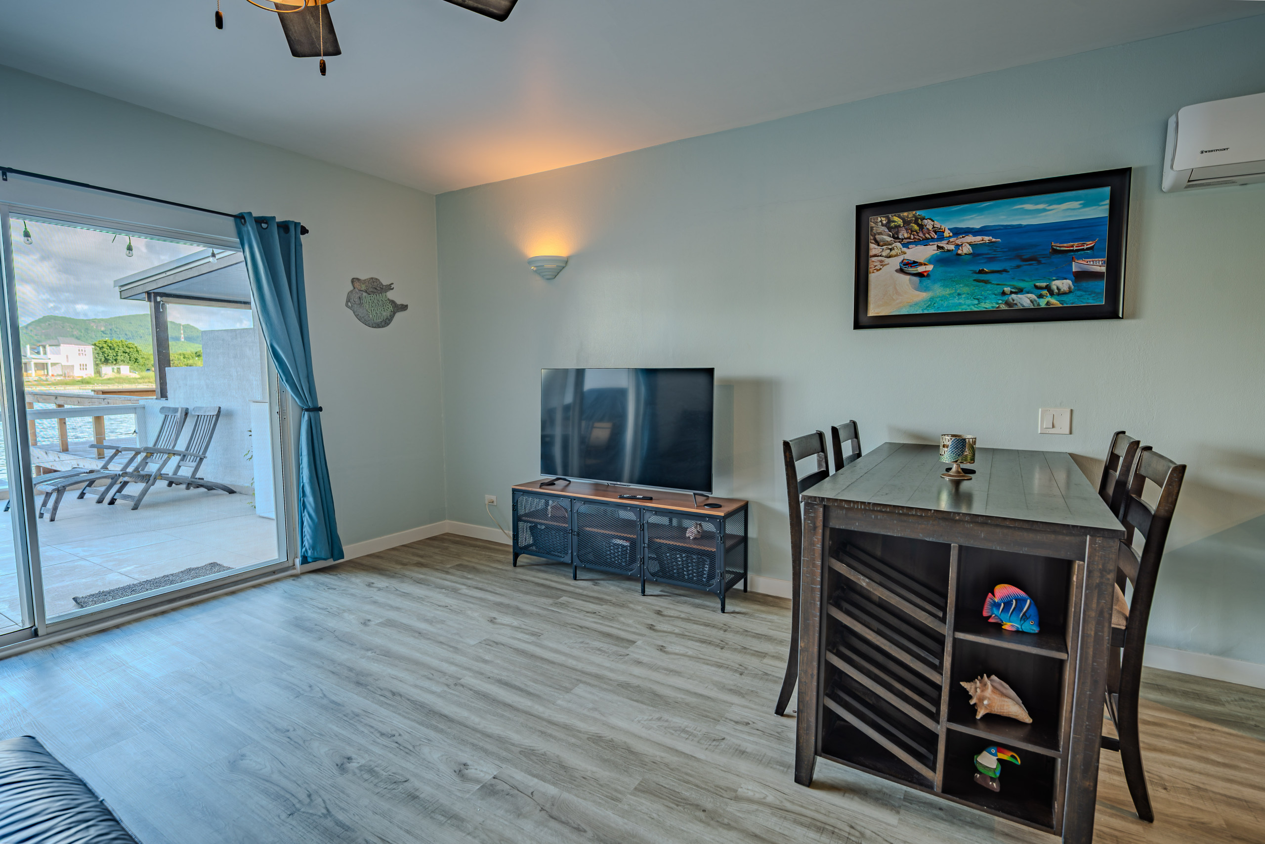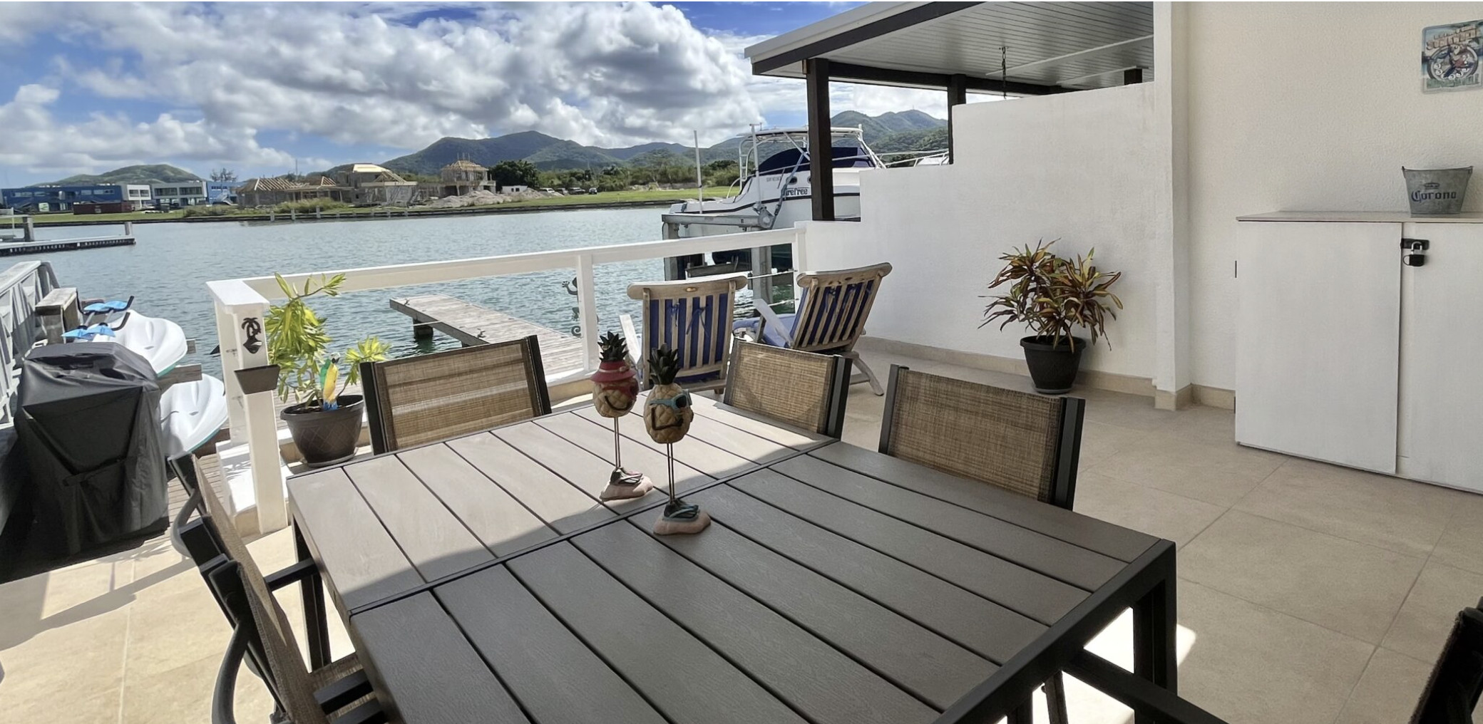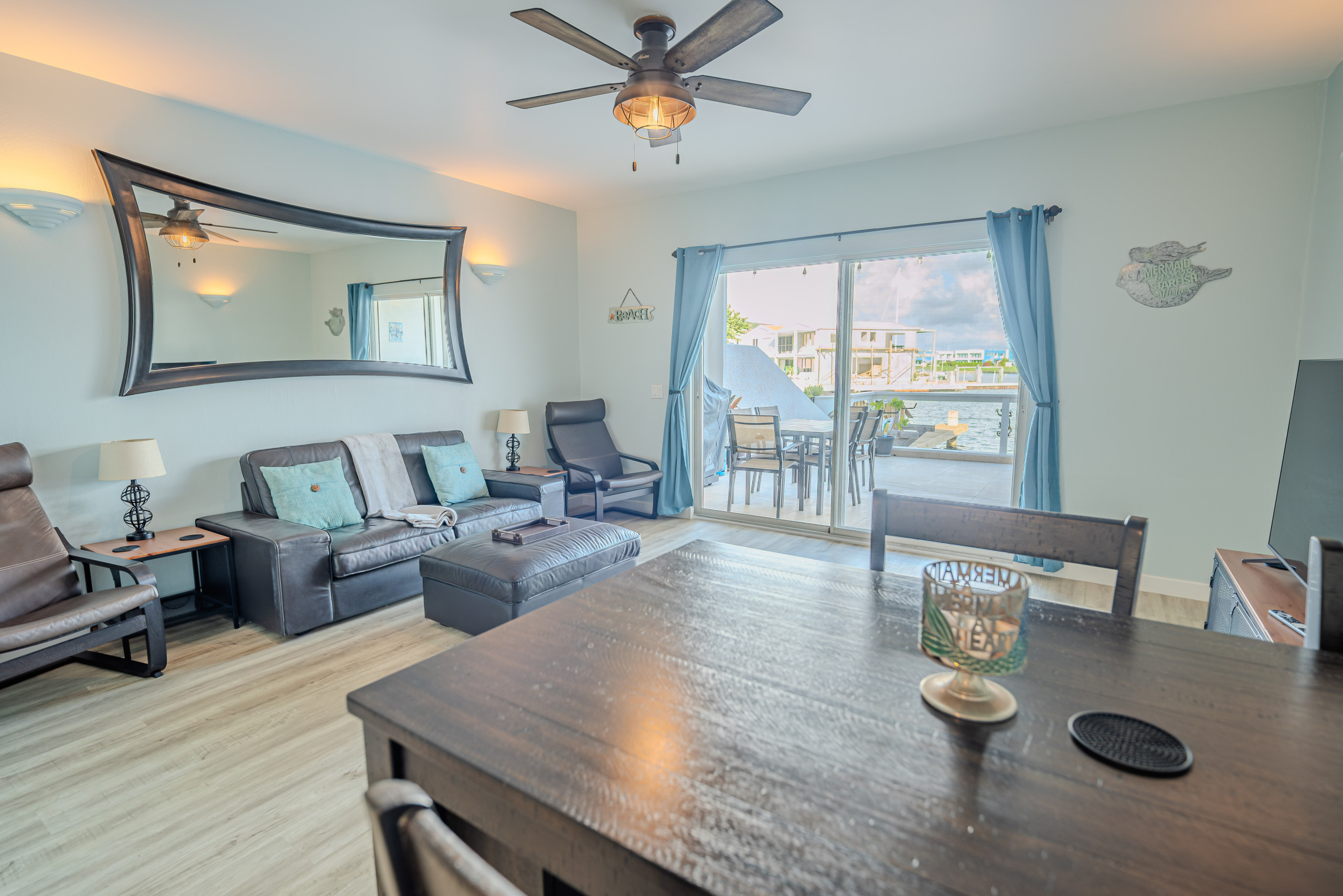 The living area flows seamlessly onto a newly tiled waterfront patio complete with an elegant dining space and retractable awning, perfect for alfresco dining or evening cocktails. Beyond lies a brand-new sundeck and 30ft finger pier, offering direct access to the marina for those arriving by boat or simply wishing to soak up the waterfront lifestyle.