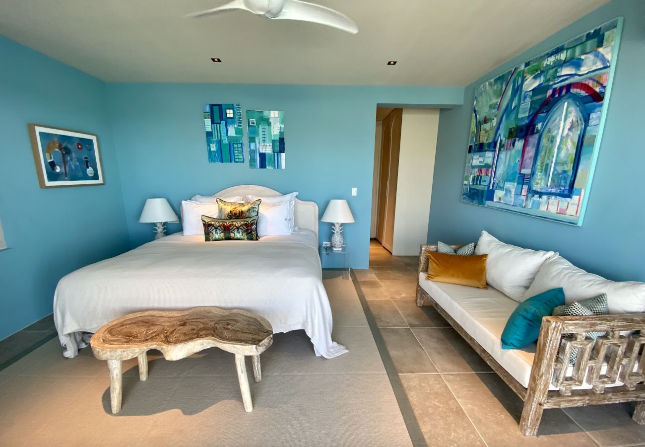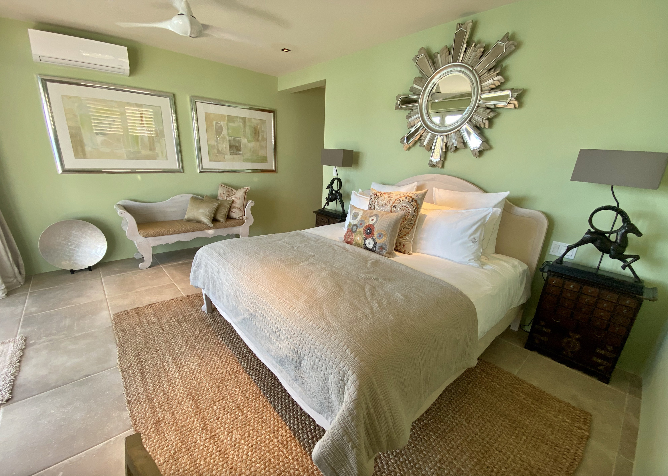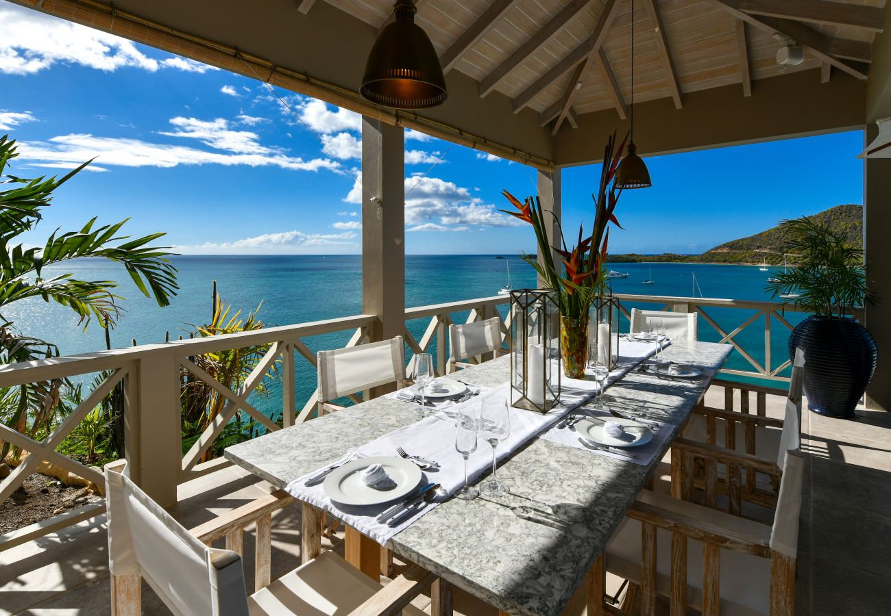 An exterior scenic staircase leads you down to the tranquil edge of the water, where you can swim in the calm, turquoise sea. Just a short stroll down the hill brings you to the pristine South Beach of Jolly Harbor, a sweeping stretch of over a mile and a half of white sands lapped by the pristine waters. Here, you'll find sun loungers and a charming local bar/restaurant, perfect for savoring delicious local cuisine and refreshing cocktails.